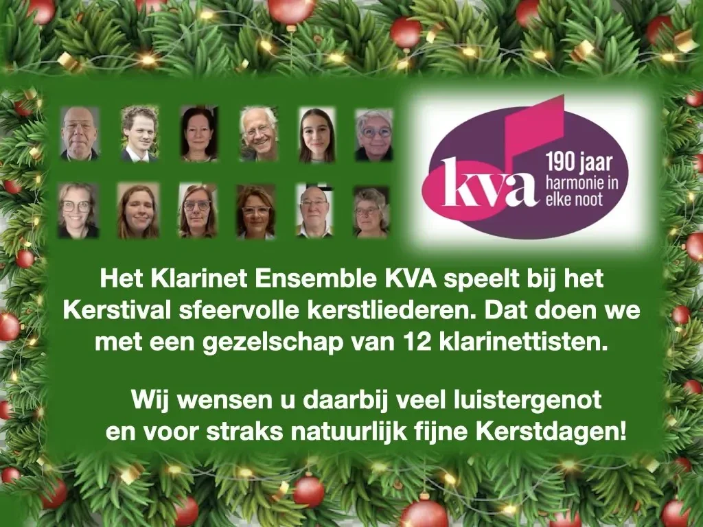 Het klarinetensemble van KVA speelt bij het Kerstival. Maar liefst 12 klarinettisten brengen er sfeervolle kerstmuziek ten gehore. Het Kerstival is van 12.00 tot 17.00 uur.